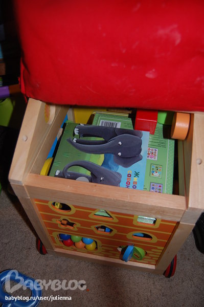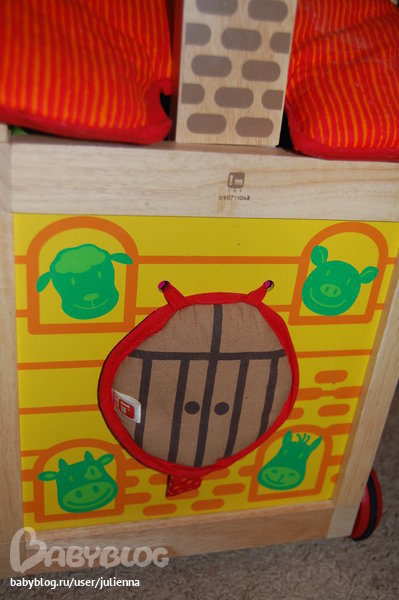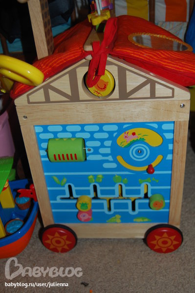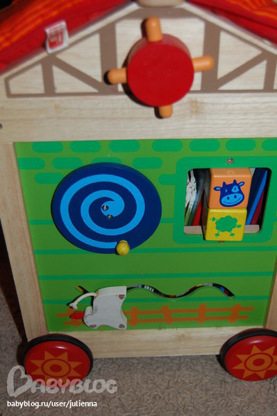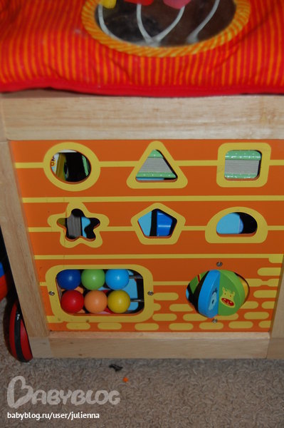 Подарен на годик. Офигенская игрушка, очень надолго занимает ребенка. На каждой стороне развивалки-лабиринты, кубики крутящиеся,счеты, сортер.Внутри можно хранить игрухи,так же действует как каталка-ходунки.