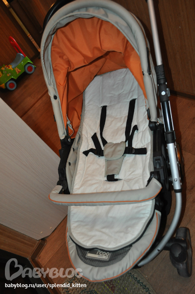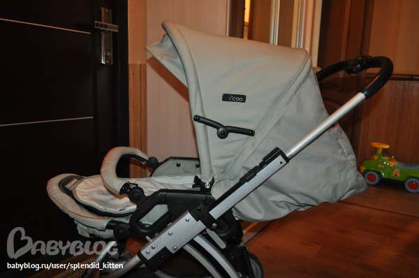 - складывающийся капюшон – 2 положения полностью открыт и полностью закрыт, открывает-закрывается тихо. Очень высокий и плохо защищает от ветра и солнца. Легко снимается и стирается под душем. Противомоскитная сетка убирается в капюшон.