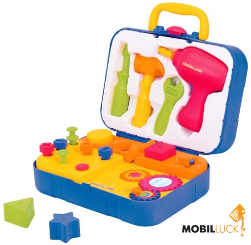 у нас такой набор kiddieland. купили, когда был 1 год - что сказатьгеометрические фигуры, когда вкладываешь пищат, дрель жужжит, молотком бьет по "гвоздикам" - пищат, колесико (справа внизу)крупишь - 12 музыки, неплохая игрушка как для разнообразия, периодически и сейчас играет, но уже как взрослыми инструментами, гвозди в стенку пытается забить