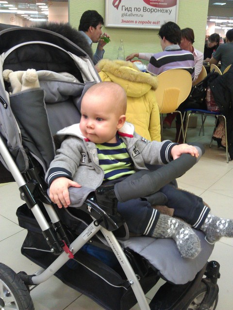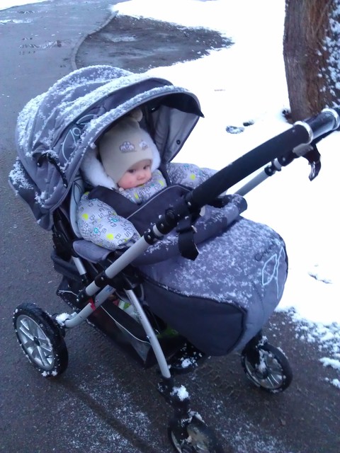 колеса - не три, не сдвоеные, побольше, лучше надувные. Чтоб сиденье было не узкое, повыше от земли и расскладывалось для сна. Чтобы ручка перекидывалась и регулировалась по высоте. Чтобы капюшон хорошо защищал, хотя бы от солнца. Бюджет - 10 т.р. Почитав многочисленные посты сделала вывод, что для таких денег, дейсвительно лучше этой коляски не найти, но я ее не видела вживую, поэтому долго оставалась как запасной вариант. Подруга сильно советовала покупать немецкую из Германии через инет, сама такую катает, в полном восторге и т.д., я не против, согласна, что качество и все прочее, НО! Хоть тресни, даже с вычетом налога и с учетом доставки самая дешовая и хоть немного подходящая под мои желания выходит 18 т.р., ну можно за 15 т.р. найти. Долго думали, советовались с мужем и решили поехать в магазин покатать. Что хочу сказать, первую Жетем кастл встретили в Детском мире, на сайте цена ок 8600, реально ок 10500р. и не очень-то впечатлила. Проехали кучу магазинов, в некоторых очень сильно удивлялась, оказывается в зиму прогулки не продают! Захожу - одни люльки, продавцы пожимают плечами. Простите, а в чем детей возят зимой, если они уже сидят? Короче, в Топтыжке встретила Concord Fusion? который мне больше всего из немцев понравился и я так была разочарована...и рада, что не заказала, она достаточно низкая по сравнению с Капеллой, Уже и у нее такой странный капюшон, из какого-то синтетического трикотажа, напоминает такой из которого чехлы в машину шьют))) В общем больше и больше душа моя склонялась к Копелле. Катали очень много разного, что-то нравилось, но дорого, что-то очень плохо каталось))) В итоге муж принял решение и мы счастливые уехали домой с Capella Castle S 803 WF. (Купили в Дочках-сыночках 8950р. Да, в интернет-магазинах дешевле, но с доставкой из Москвы выйдет так же) Я пока по улице не катала, первый поехал муж и обещал, что я буду в восторге, ну посмотрим, главное, что малышу понравилась!!! И конечно, фотки:
