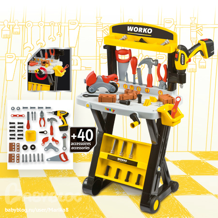 Ура! Подарили мы вчера сыночку первый набор с тачками!! Ребёнок в восторге! Не расстаётся с инструментами ни на минуту)) Только я ещё отдельно купила маленький наборчик (каска, очки и молоток), и у нас получилась прям супер-мастерская с полным обмундированием!!!