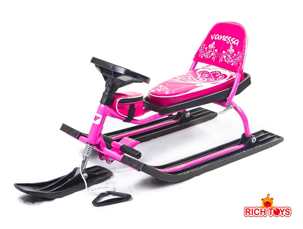 И так снегокат Ванесса. Внешне размер снегоката такой же как у "аргамак", "стелс", только он розовый и со спинкой =) спинка прочная, фиксируеться с ппомощью металлического зажима, довольно туго, то есть не болтается, чехол на спинку зам.кожа, фиксируется на липучки, убирается в сумочку которая из того же материала, спинка опускаеться вперед, она не мешает. я вроде помещаюсь на нем и впереди место для дочки есть. лыжа на пружине, сидение мягкое там поролон. тормоз понажимала - нормально. трос привязывается за металлическую петлю на фото видно. краска не обдирается, сколов нет, пластик тоже вроде прочный, ну как уж в деле только зима покажет а пока вот....