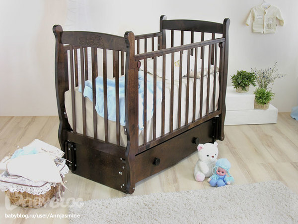 Закрытый ящик (на первых фото правда кроватка задом наперед стоит, ручки на ящике круглые, крепкие). Матник бесшумный и плавный, фиксатор металлический, не сломать)...Два положения ложа. Боковинка опускается, механизм для ребенка безопасный, в будущем сам не опустит и пальчики в него не просунет, можно будет снять две центральные реечки как подрастем, чтобы мылышка сама забиралась в кроватку, а потом и убрать всю переднюю стенку...