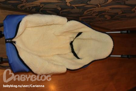 Конверт сконструирован очень удобно. Сзади есть кармашки и резиночки, все надежно фиксируется и никуда не съезжает. Сам конверт не очень толстый, но на счесанной овечьей шерсти, думаю, малышу будет тепло.