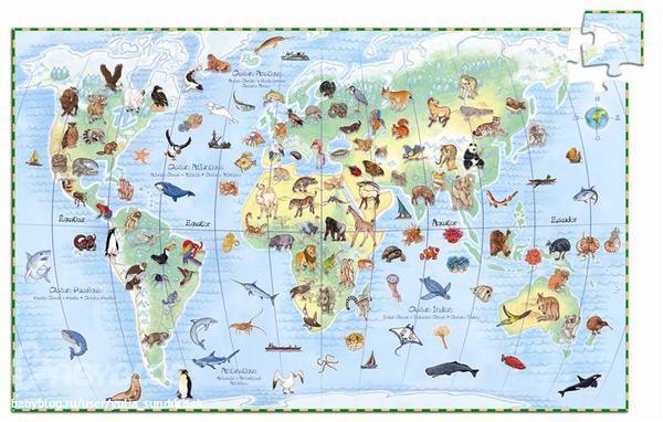 С помощью этого удивительного красивого пазла Вы и Ваш ребенок смогут совершить настоящее путешествие по всему миру, открыть для себя богатую фауну Земли. Ваш малыш познакомится с животными, живущими в Африке, Америке, Европе и других частях света. В наборе Вы также найдете буклет с указанием названий животных. В комплекте: 100 деталей, буклет, плакат.
