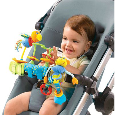 мы обычные вещали http://www.neopod.ru/products/Canpol_2-614/ типо такой, примерно до пол года интересна, потом уже нет, так отдельно ей в коляску погремухи и игрухи брала