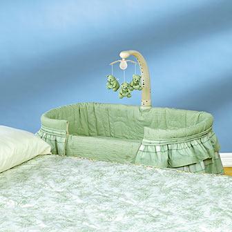 - комплект текстиля из 100% хлопка: мягкие набивные съемные борта, натяжную простынь, пододеяльник и белое стеганное одеяльце (80смХ80см), подушку и наволочку (30смХ40см), и шифоновый балдахин.