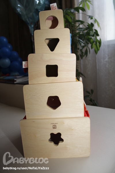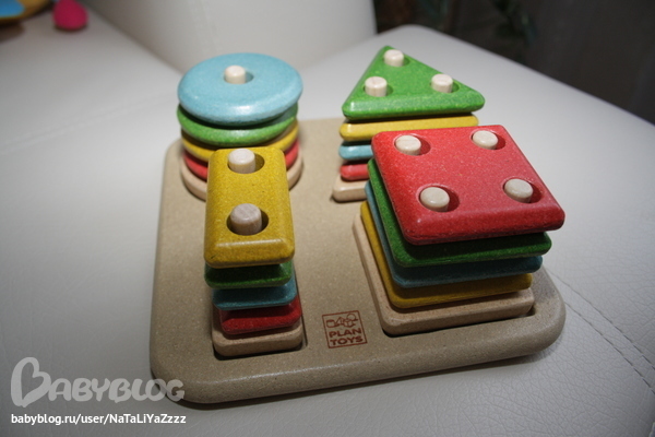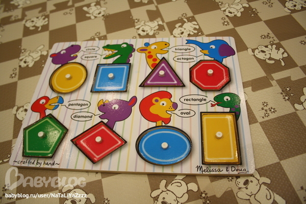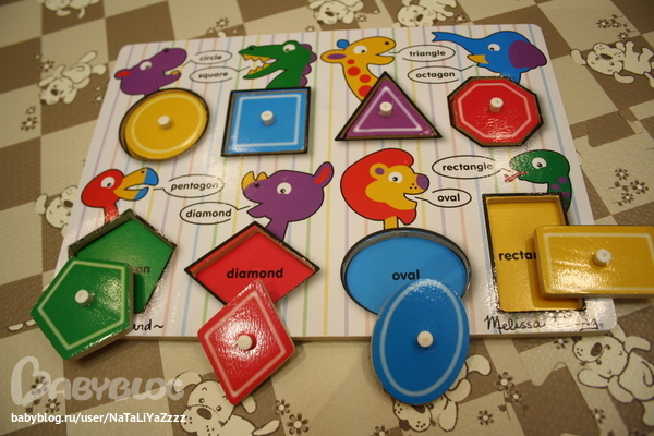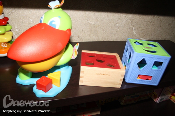 Сортеры. Различает фигуры -круг, квадрат, треугольник, прямоугольник, звезда, ромб. Вставляет круг, квадрат, иногда может вставить звезду. Правда сейчас интерес поубавился, баловаться стал - кидает или грызет фигурки