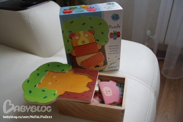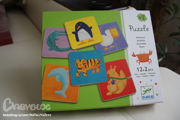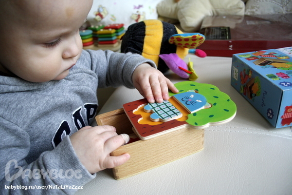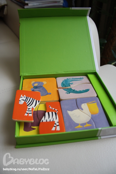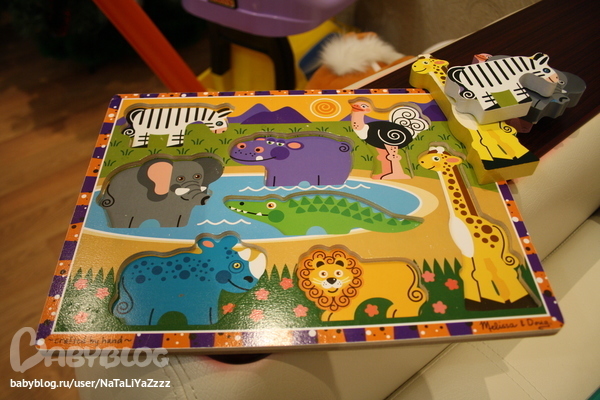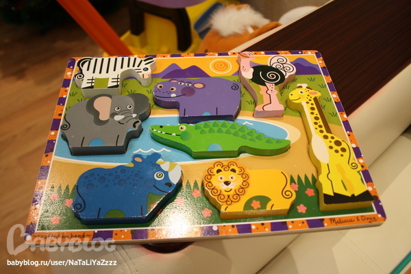 Еще один пазл. Тоже из разряда первых. Деревянный,очень качественный. Тёма животных на них показывает. Собирать пока не хочет. Подождем ))