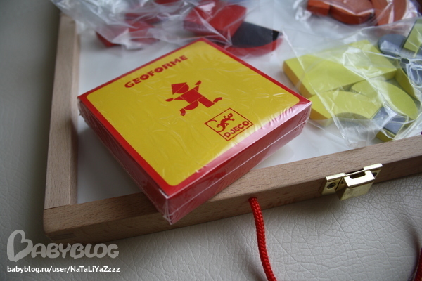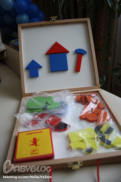 Магнитная доска. Супер-вещь!! Нам еще рановато, конечно, но на вырост - отличная! Хотя и сейчас смотрим с удовольствием простые формы, цвета, мама составляет фигуры, а сынок разбрасывает их по всей квартире. В наборе деревянные магнитные фигурки и карточки с примерами от самых простых до сложных.