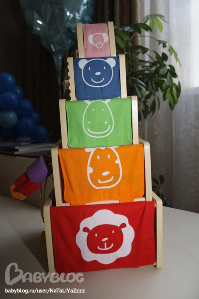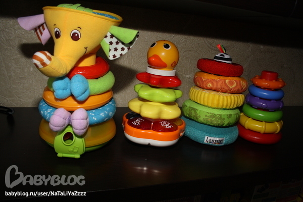 Пирамидки. В слона в основном кидает шарики, остальные пирамидки собирает. По порядку собирает. только если называю по цвету колечки. Еще две пирамидки отвезла к маме - деревянную и чиковскую музыкальную. Там тоже собираем ))