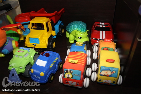 Еще очень любит мячи, кидает мне, я ему, ногой пинаем, разные шарики, может по старой памяти погремушку какую-нибудь из ящика достать и ходить с ней )) Всякие музыкальные телефоны, небольшие машинки тоже не стала фоткать, всего этого много, и все по разным комнатам )) Спасибо за внимание )