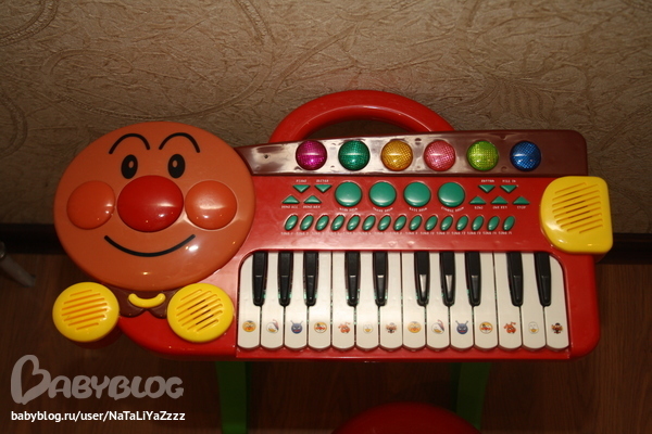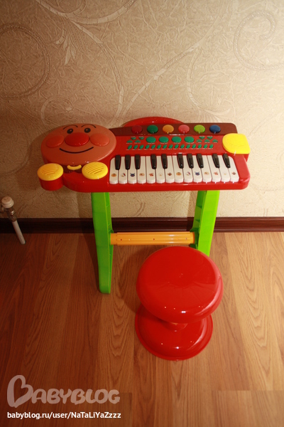 Пианино со стульчиком. Включает\выключает сам,нажав на носик. По клавишам пальчиком долбит, проходя мимо, иногда включает мелодии