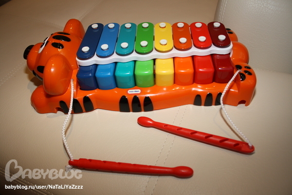 Ксилофон. Пока больше играю я. Но Тёма иногда берет палочку и стукает. Или на клавиши нажимает. Мне нравится, но немного на вырост.