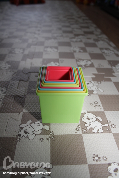 Стаканчики. Мы по ним изучаем цвета (потом как-нибудь напишу про наши занятия), строим башню (правда, Тёма только 3 стаанчика ставит, на этом его терпение заканчивается и он начинает все рушить), в стаканчики всегда что-то складываем и кричим в них (Тёме нравится, когда голос меняется).