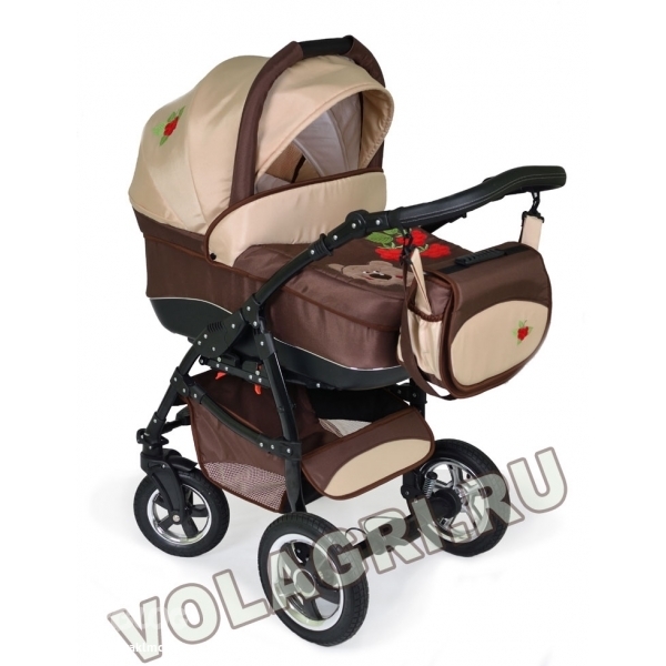 коляска LEO «Мишка с малиной» комбинированная 2 в 1 с передними поворотными колесами (люлька + сменный прогулочный блок, надувные колеса, сумка, дождевик, москитная сетка)