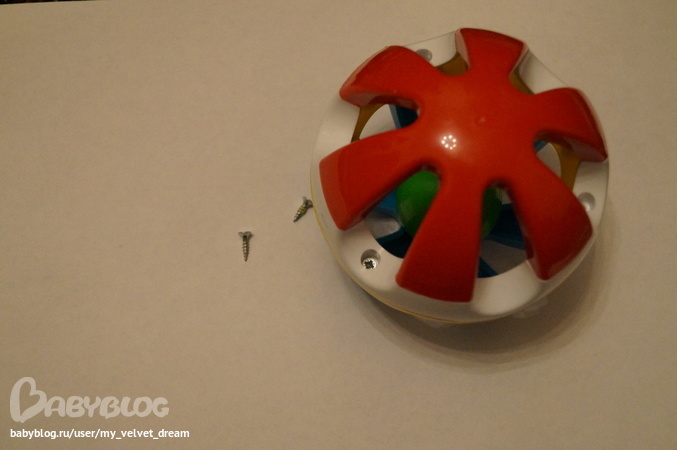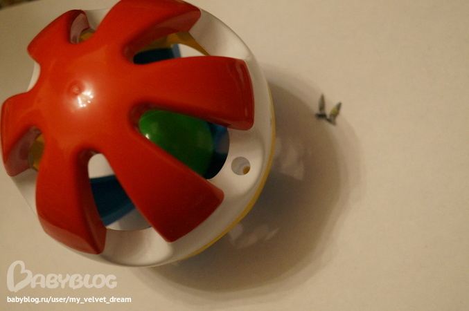 2 игрушки из набора: грибок-неваляшка и погремушка-карусель,вроде нормальные,ничего такого не заметили,а вот третья(мячик с гремящим шариком внутри) скручена 12 саморезами. Мы посмеялись над игрушкой для "челябинских детей (да простят меня мамы славного г.Челябинск). Знали бы над чем смеялись,выкинули бы сразу эту чудо-игрушку.А ведь думали,что надежно