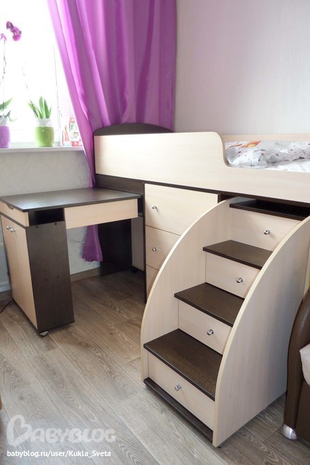 Дочка от кровати в восторге, как долго она ее ждала!:)) Обожает лазить по лестнице туда-сюда, сама ее выдвигает и задвигает, но при этом лестница очень устойчивая, сама никуда не уезжает! Ребенок доволен, родители спокойны:)