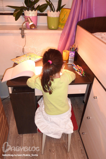 Небольшое дополнение по поводу стола. Его, как и лестницу можно установить либо справа, либо слева, по желанию. Так вот, если его ставить, как у нас (слева) это не совсем удобно при письме, рисовании, т.к. локоть все время норовит столкнуться с бортиком кровати, это не критично, но все же. В идеале конечно, когда стол ставится в правую часть кровати, тогда для правой руки ребенка освобождается куда больше площади при рисовании.