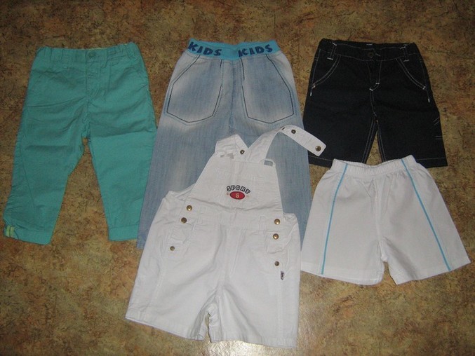 бирюзовые штанишки H&M,джинсы глория,шортики от Бебуша и из глории.и мой любимый песочник(подружка привезла из испании).Еще есть пару джинсиков бенетон и H&M