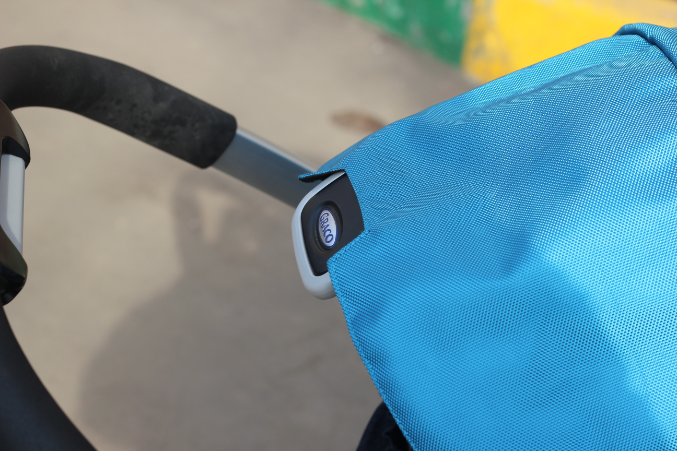 Тормоз находится на самой ручке сбоку (например на фото с люлькой его видно). Чтобы поставить на тормоз нужно поднять рычажок вверх, чтобы снять надо одновременно нажать на кнопку и опустить рычажок.