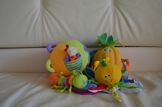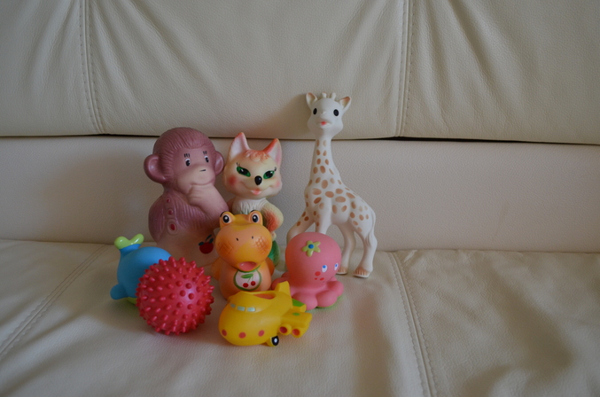 Резиновых игрушек у нас много, пару слов о популярной игрушке - жираф софи, купила когда сыну было 3 месяцев (заказала на е..й, получился в два раза дешевле) занимался ей активно месяцев до 7, грыз ушки, морду ножки.
