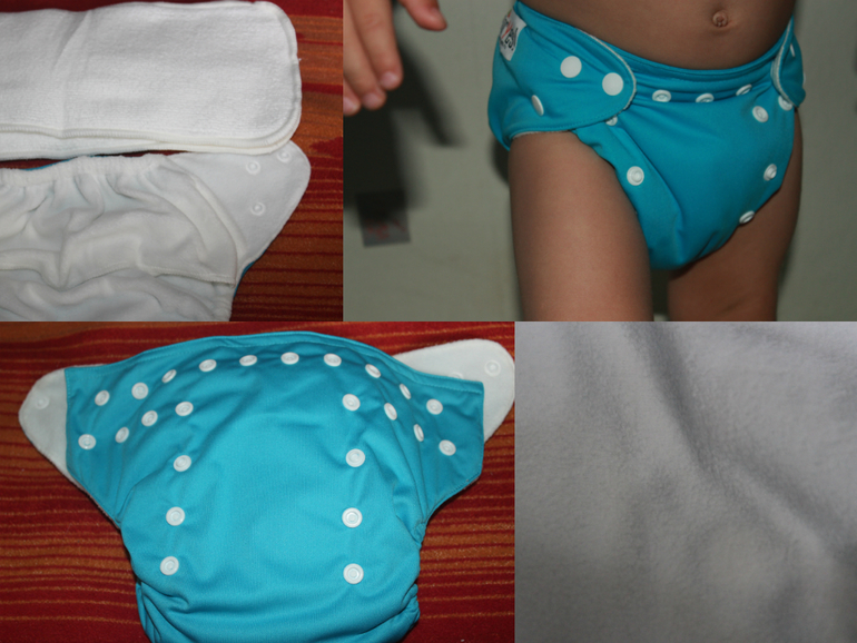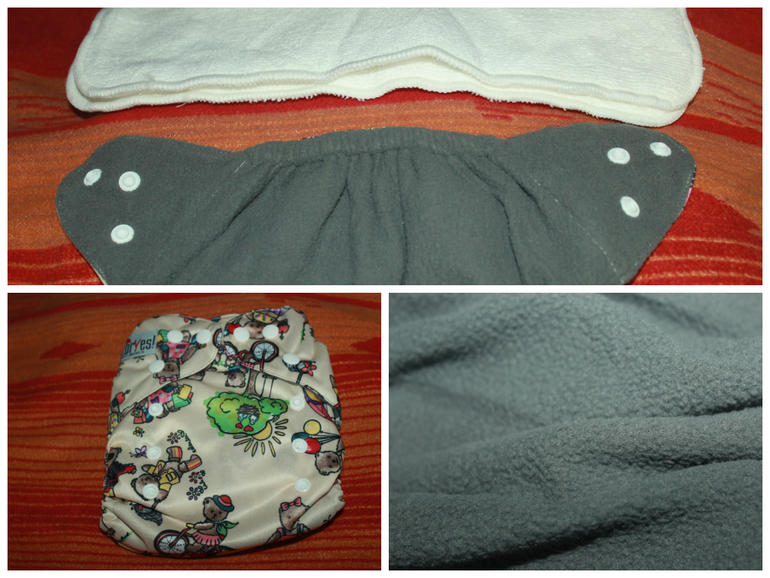 Внутренний слой микрфлис, очень приятный на ощупь и дышащий. Он не впитывает влагу, а пропускает ее через себя во вкладыш. Я была поражена, когда после " пописа" сняла многоразовые подгузник, провела рукой по внутреннему слою и он был сухой. Правда этот эффект не сохраниться, если вы долго не меняете подгузник или малыш обильно сикает.