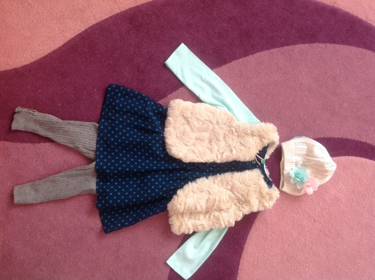Надо поменять легинсы либо отдельно купить серую либо цветом как у девочки шарф майку и к ним колготы,легинсы в тон,но цветочек на шапке в таком случае-я бы сняла,и получился бы акцент на жилете