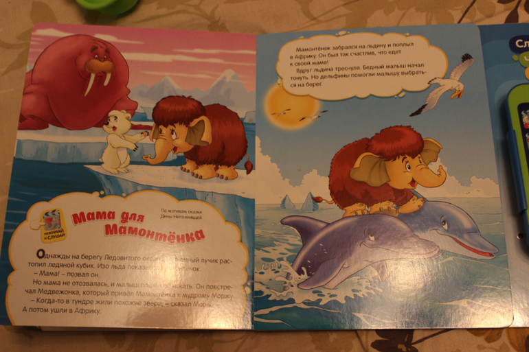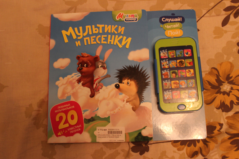 "Мультики и песенки" от "Азбукварика". Ну, здесь не только книга. Покупала конечно из-за так называемого плеера, который проигрывает 5 сказок и 15 популярных песенок из наших любимых мультфильмов. Штука оказалась отличной, мы всегда берем ее на прогулку и пока я катаю сына в коляске он слушает сказки и песни. Единственный на мой взгляд промах - кнопки не выпуклые, маленьким ручкам придется приноровиться, чтобы нажать. И жаль, что песни представлены не в оригинальном звучании. Хотя в целом все равно озвучка приятная. Ну и книга - яркая, с плотными картонными страничками. В общем и целом мы довольны покупкой.