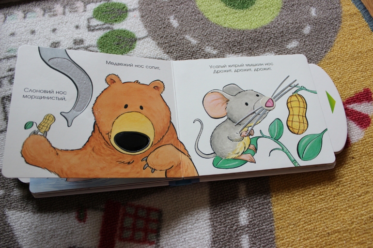 Книги небольшие, с толстыми страничками, и наверное больше "игрушечного" характера. На страницах есть тактильные элементы. С краю у каждой страницы есть стрелочка, которая приводит в движение одного из персонажей. В книге чисто символические, коротенькие стишки. Но все равно идея хорошая.