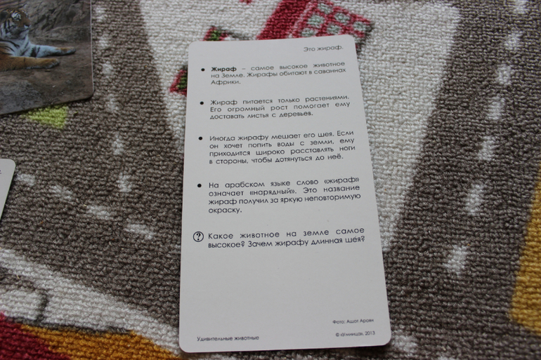 Ну, и напоследок карточки "Удивительные животные" из серии Мир на ладошке от Умницы. Купила на Мамси, решила попробовать что это такое. Пособие неплохое. Карточки из плотного картона с фотографиями животных. Сзади о каждом животном написано несколько интересных фактов и есть пример вопроса, который можно задать ребенку. Хотелось бы более ярких фотографий зверушек. А в целом отлично. Посмотрим, заинтересует ли сына.