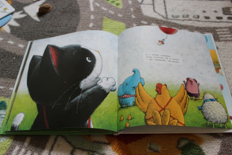 Приобрела по положительным отзывам. Мне в принципе книга понравилась. Картинки очень красивые и милые, идея неплохая. Вкратце - котенок потерял свою пустышку. Она оказалась на улице и каждый герой книги по-своему пытались ее приспособить. Забавно. В конечном итоге, когда пустышка снова попала к котенку он привязал ее к воздушному шарику и пустил в небо, аргументируя, что таким большим деткам пустышка уже не нужна. Связи я не увидела, но возможно я уже просто цепляюсь)