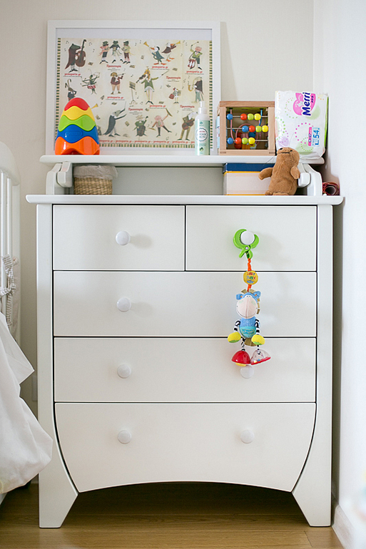 До года мне было удобно разложить вещи следующим образом. В верхних ящиках - аптечка и запас памперсов, во втором - актуальная сезону детская одежда, в третьем - пледы, пеленки, одеялки и полотенца, в нижнем - одежда на вырост. Сейчас пеленками и одеялами мы уже не пользуемся, поэтому они освободили место для детской одежды, которой нужно все больше места. Всю одежку, которая становилась мала, я партиями складывала в большой мешок и убирала на самую верхнюю полку нашего с мужем шкафа - дожидаться нового хозяина:)