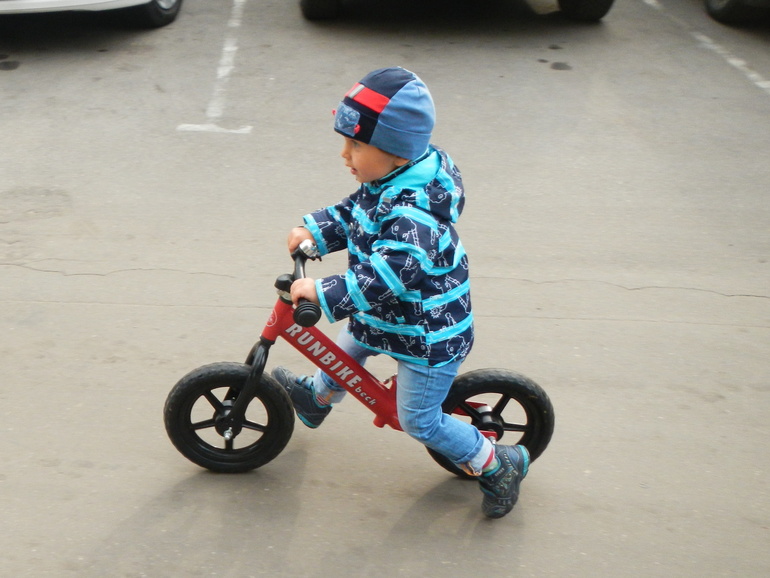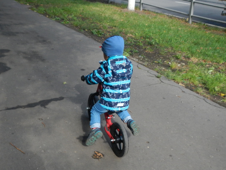 И вот мы вернулись в Москву, и я теперь за ребенком бегаю, катается отлично, разгоняется и поднимает ноги, уверенно держит равновесие, правда пока не ставит ножки на подставку с сзади, а просто держит их на весу: