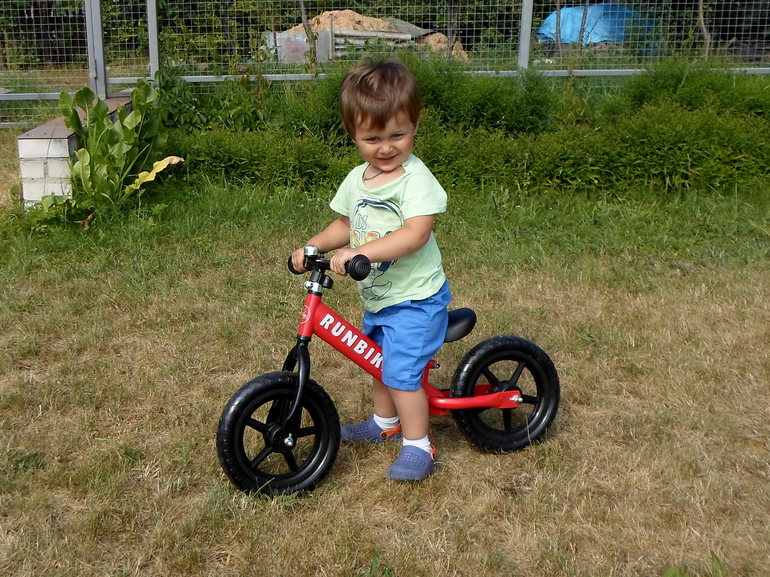Беговел был подарен на ДР сына, которое мы проводили на даче. Сын был безумно доволен, помогал его собирать (собирается очень легко), а потом сразу оседлал: