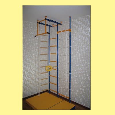 Понравилось, что есть веревочная лестница, кольца, канат. + докупим мат обязательно. Крепление в распор. "Городок Г-образнеый с сеткой 60 см"