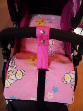 Первым делом занялась перемычкой. Найдя в магазине боле-менее подходящую ткань, я решила сшить еще и матрасик в коляску. В нем сделаны все прорези для ремней. На фото у перемычки две кнопки. Одна для закрепления перемычки на бампере. Другая для закрепления перемычки на пластиковой фурнитуре ремней безопасности. Сделано это для того, чтобы пластик не давил на дочь, когда она пристегнута этими ремнями.