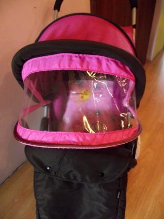 Таким образом капюшон получился до бампера. При желании его можно спокойно опустить. Дочери нравится им пользоваться в ветреную погоду. С одной стороны, она полностью закрыта от ветра, с другой - у нее есть большое смотровое окно для наблюдения за миром. А еще чаще ей нравится спать в разложенной коляске. Вот так коляска выглядит теперь.