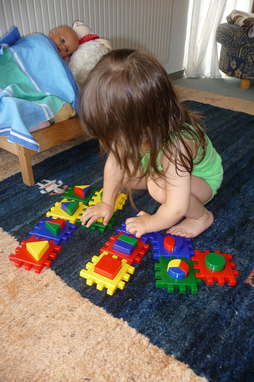 Пазл можно исспользовать по частям, для изучения геометрических фигур, части и целого, дробей, а так же из пазла можно конструировать, чем и занялась, в первую очередь, моя Эвочка.