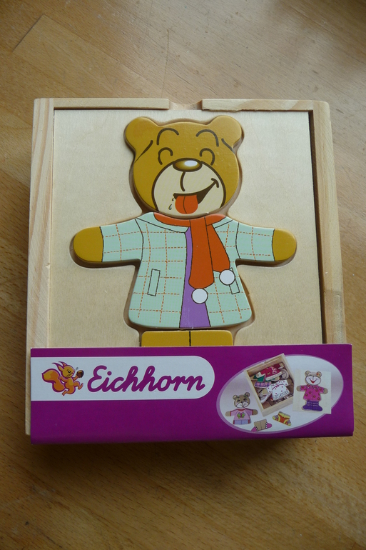Третья игрушка - это редевянный пазл "Одень мишку" от Eichhorn.