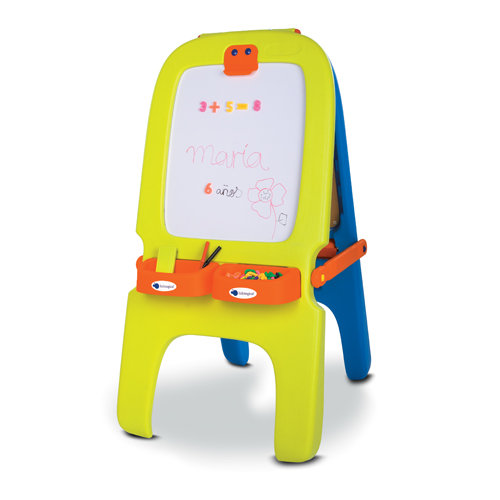 Нам подарили из elc. Мне очень нравится мольберт, он высокий, деревянный. Одна сторона магнитная, на ней рисуем маркерами, так же там крепится рулон бумаги, и есть стаканчики для рисования красками, с другой стороны доска для рисования мелом.