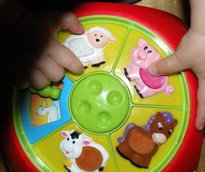 На одном стороне животные как произносят звуки, плюс короткие стишки, на другой мышка выпрыгивает из норки и считалочка, потом пианино есть с разными инструментами музыкальными звучащими, а еще тип юлы с шариками и звуками разными, типа плеер с детскими милыми песенками, такой диск стоит, открывается крышка, можно достать игрушечный диск и кнопки пуск, стоп и открытие крышки. А еще часики тоже с песенками.