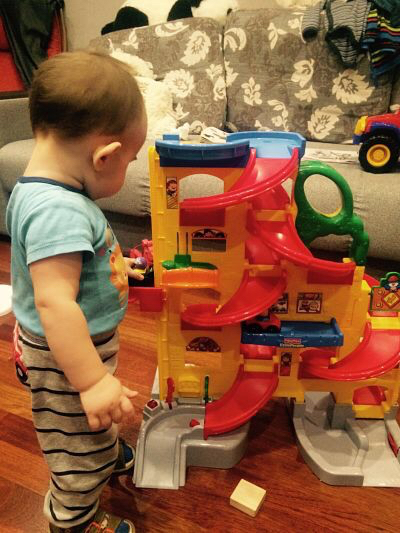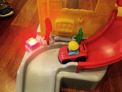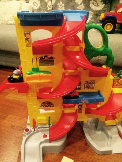 Парковка сразу покорила всех, кто был у нас в гостях-сына, племянника, меня конечно же, мужа и мою маму. Довольно высокая-61 см. Детям удобно катать машинки. Сыну год, племяшу -1,8, оба были в восторге, особенно племяш. У парковки два спуска спиралью для машинок (2 машинки в комплекте), есть лифты, окошки шиномонтажа, ресторана, заправка, шлагбаумы. Если вставить три батарейки, то при спуске машинок по одной из дорожек внизу будут раздаваться различные звуки и гореть лампочка наподобие светофора. А также если поставить машинку заправиться бензином.