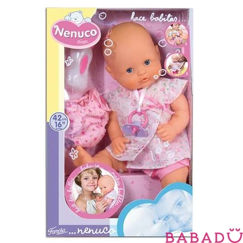 Очаровашка Ненуко покорит ваше сердце! Восьмимесячная малышка умеет пить из бутылочки и писать. "Маме" придется следить за тем, чтобы на Ненуко всегда был ее памперс. Куклу можно усадить на горшок, чтобы она "сделала свои дела" по всем правилам. Малышка Ненуко приготовила для вас сюрприз: если нажать на ее ручку, то кукла будет пускать пузыри! В коробке с куклой молодая "мама" найдет все необходимое: горшок, пустышку на ленточке и бутылочку для кормления. Ухаживать за крошкой Ненуко сможет любая девочка, если ей уже исполнилось три года.