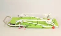С этими санками Вы без труда проедете по асфальтированному или посыпанному участку дороги, а также спустите санки из дома на улицу. Все это возможно благодаря четырем выдвигающимся колесикам. Вам достаточно перед затруднительным участком пути нажать на перекладину, расположенную спереди и сзади санок и поставить санки на колеса. Теперь полозья выше колес и не касаются земли.