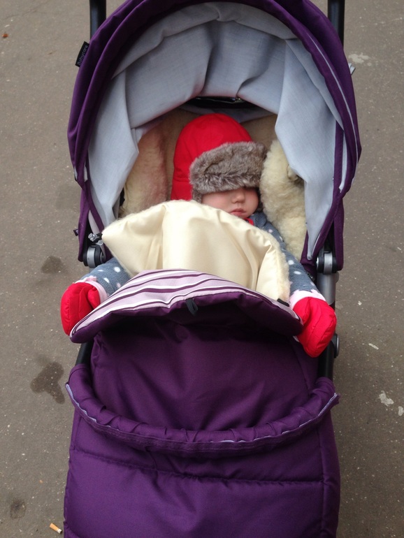 Накидка на ножки: очень удачная. Крепится на две кнопки по бокам рамы, выглядит аккуратно. Можно отвернуть и закрепить на пуговичку верхнюю часть, если она не нужна, к примеру когда ребенок сидит. Хорошо держит форму, внутри на ощупь поролоновый наполнитель. Если ребенок лежит - то можно укрыть его до подбородка. Накидка не болтается, но при этом натягивается на зимний меховой овчинный конверт.