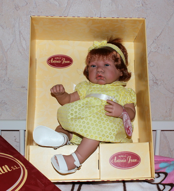 От бабушек мы заказали испанскую куклу от Antonio Juan. Выбрала я куколку Флору.Тело у куклы мягко набивное ,ручки ,ножки и голова сделаны из винила.Кукла 40 см.Вот она наша Дашенька.Волосы прошиты.Реснички,как настоящие.