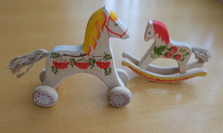 Лошадки - это наше все)) Очень уж дочка уважает всяких гого. Потому взяла сразу 2. Одна катается на колесиках (а на спинку ей можно поставить что-то небольшое), а вторая - качалка. Расцветки были растительные, выбрала вот такие. А, еще брала совсем маленькую на подарок-сувенир, она тоже качалка. Единственное, что выглядит не очень - это хвосты (кажется у самой маленькой хвост просто деревянный был). Но дочку это нисколько не смущает.