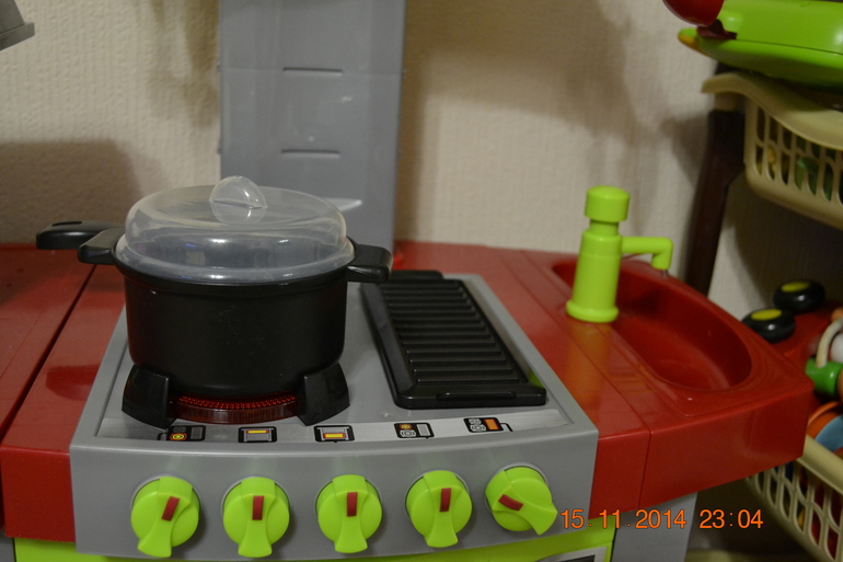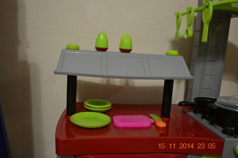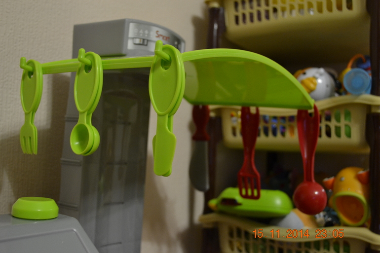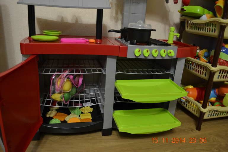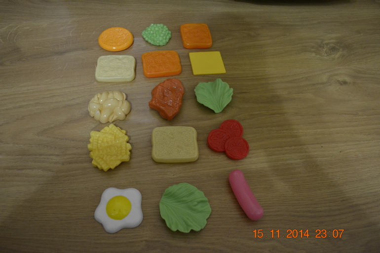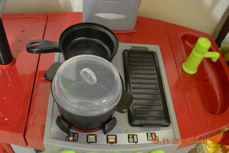 3. В наборе 38 аксессуара (некоторые в двойном экземпляре). Это посуда (кастрюля . с крышкой которая, кстати, подходит и к сковородке, собственно сама сковородка, 2 тарелки, 2 блюдца, солонка и перечница); столовые приборы (ложки, вилки, ножи, шумовка, лопатка) и различные муляжи продуктов (яичница, сосиска, помидор,...).