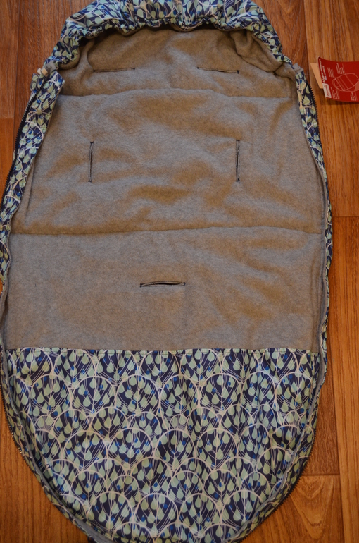 Размеры конверта: 53×105 см. Но хочу заметить, что несколько сантиметров длины съедает "капюшон" на резинке.